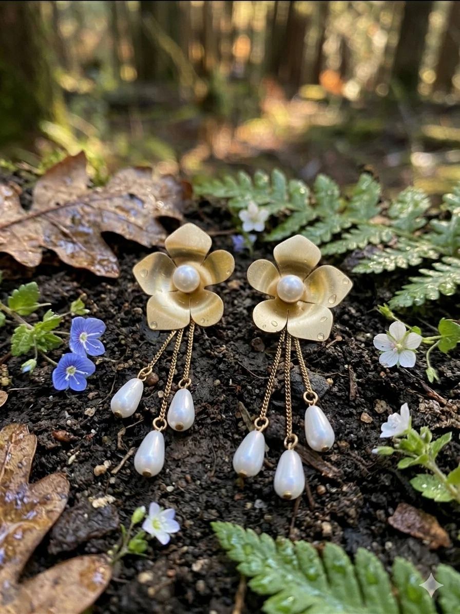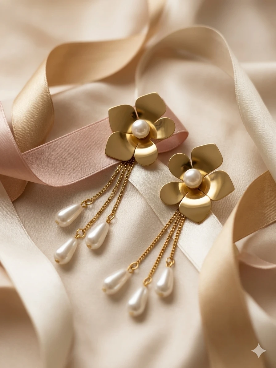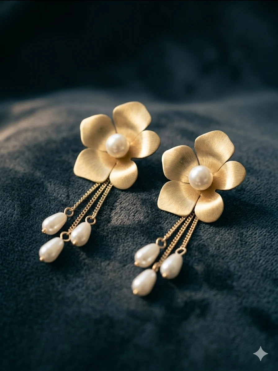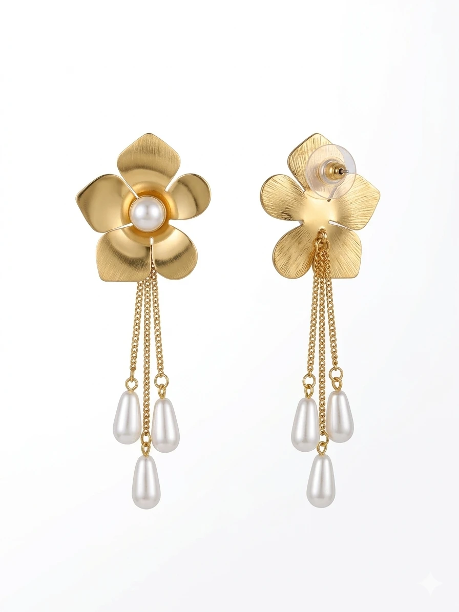 The design of the Aurora Flower Chain Earrings is inspired by the ethereal glow of the morning sun hitting a blooming garden. Each earring features a meticulously sculpted floral stud with five delicate petals, finished in a soft, matte gold-tone that exudes a premium, vintage aesthetic. At the heart of each flower lies a pristine, shimmering pearl, symbolizing purity and eternal style.