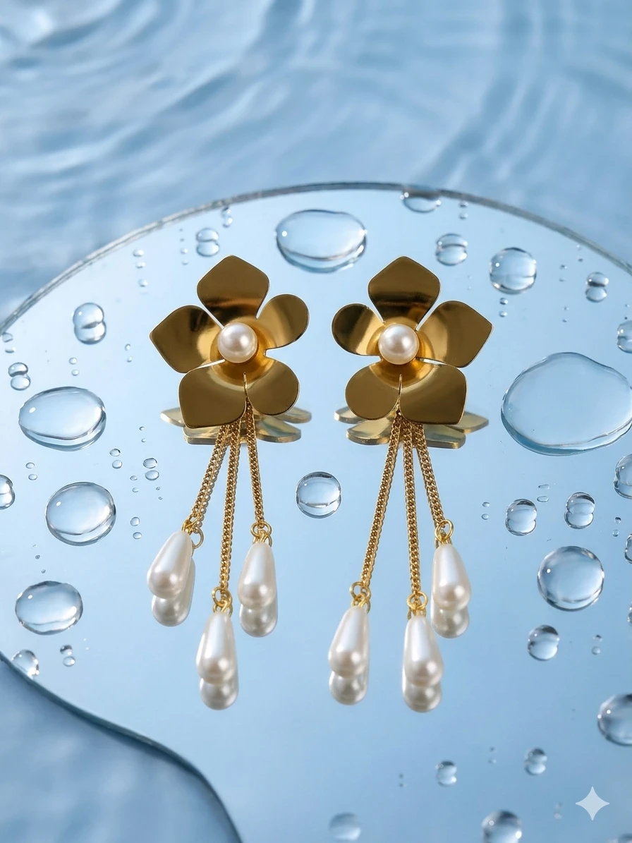 What truly sets the Aurora Flower Chain Earrings apart is the cascading triple-chain detail. From the base of the golden flower, three fine-link chains descend at varying lengths, each carrying a luminous teardrop pearl. These “chains of light” are engineered to move with you, catching the light with every turn of your head and creating a dynamic, eye-catching shimmer.