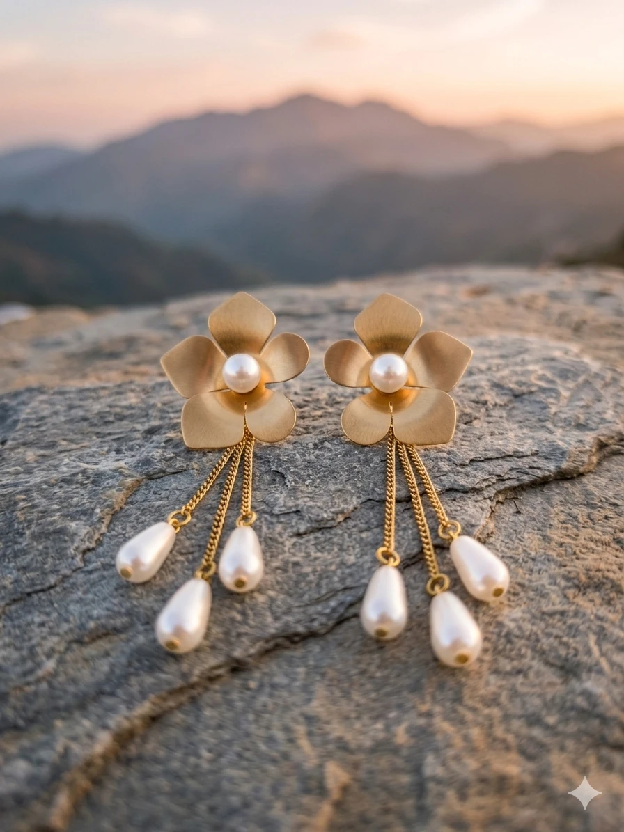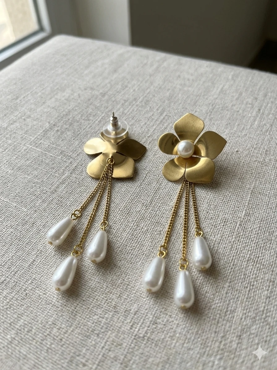 The Aurora Flower Chain Earrings are masterfully versatile. For a traditional look, pair them with a cream-colored silk saree or an embroidered lehenga to highlight the gold and pearl tones. If you prefer a western silhouette, these earrings act as the perfect statement piece against a deep navy cocktail dress or a sleek white jumpsuit.