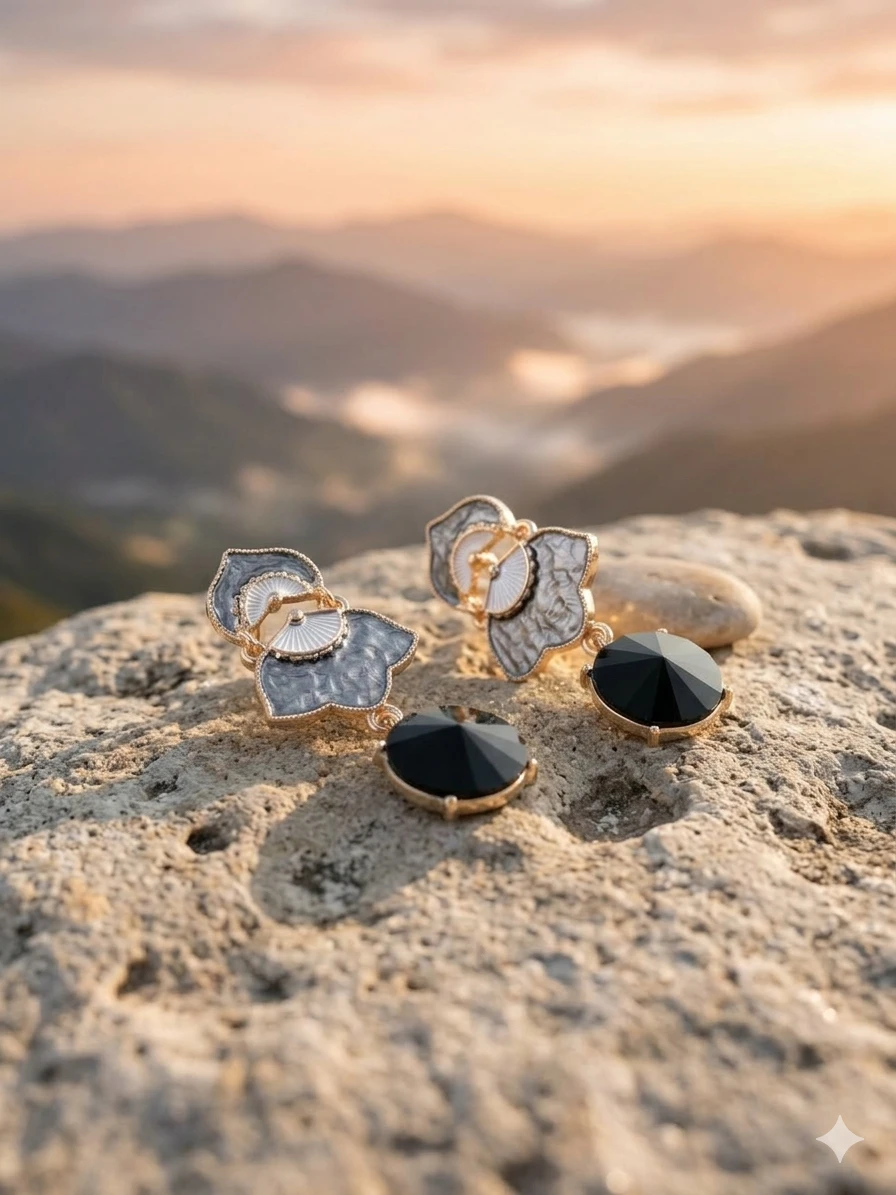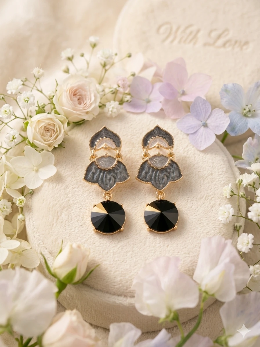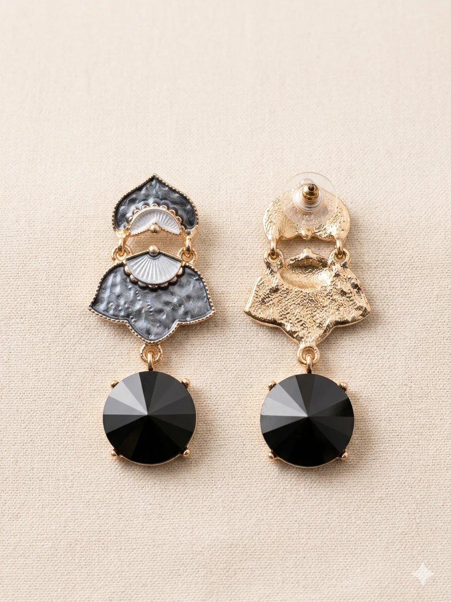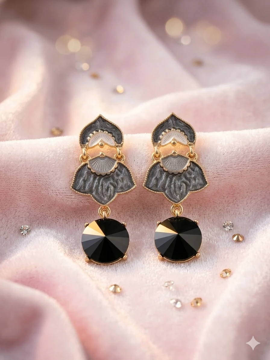 Black Vintage Drop Earrings: Make a dramatic statement with our Earrings, expertly crafted to blend old-world charm with modern noir. These Obsidian Petal Danglers feature a unique, tiered petal design with detailed grey enamelwork, finished with a striking, faceted obsidian-black crystal that catches the light with every turn.