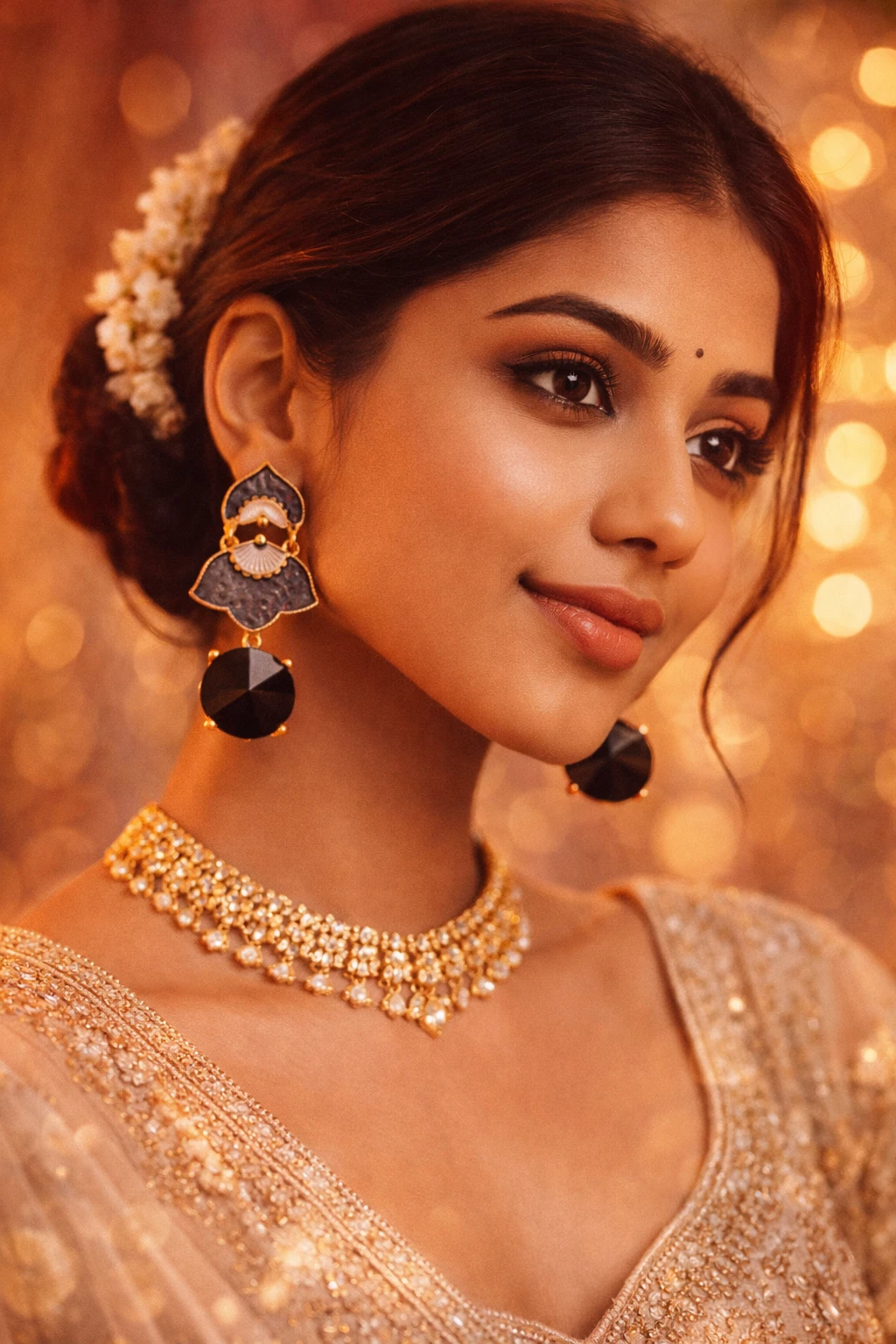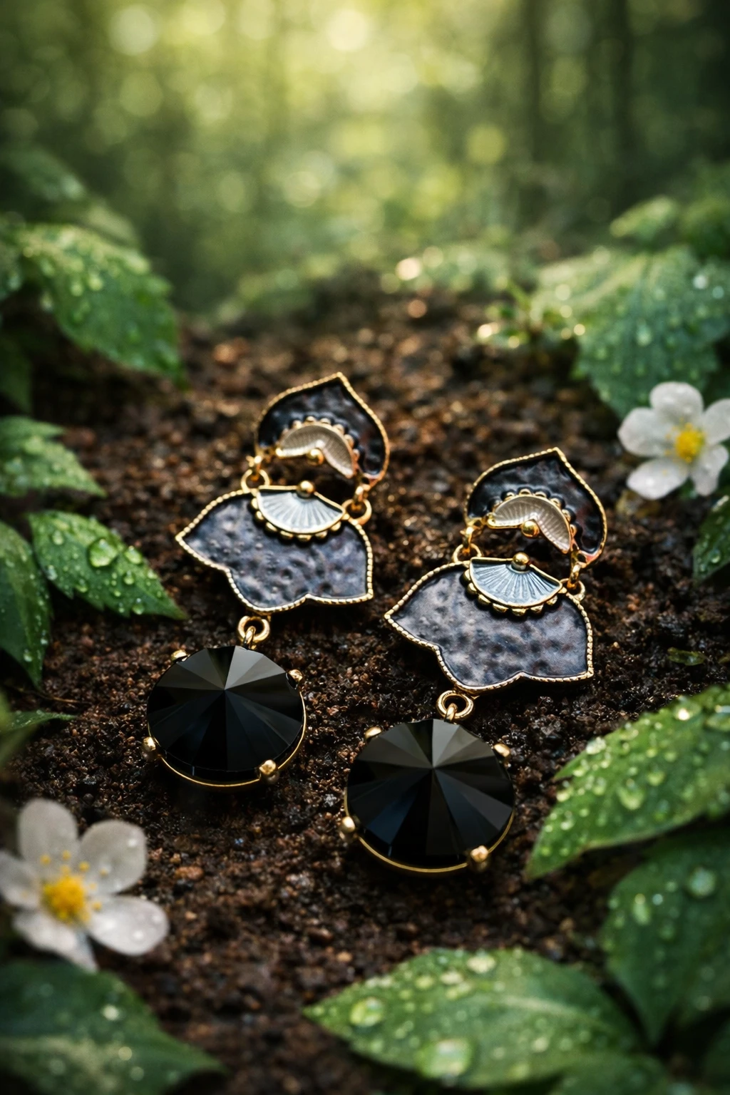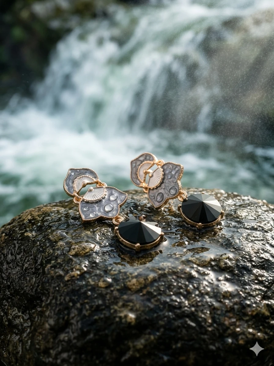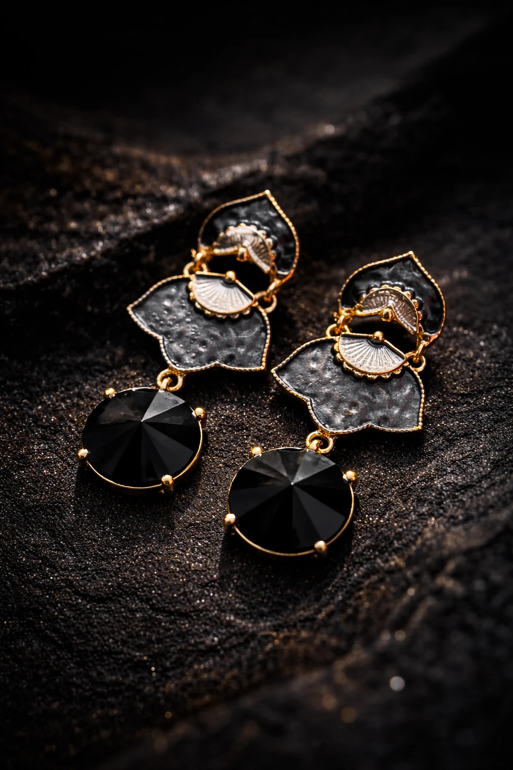 Faceted Brilliance: A large, round-cut black stone hangs below, offering a sharp contrast to the delicate metalwork.