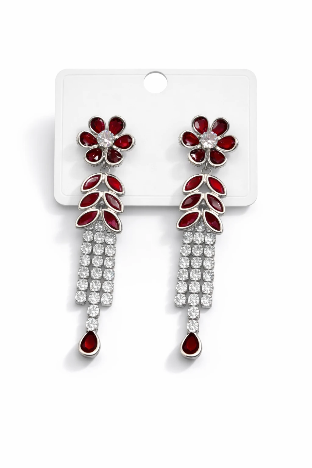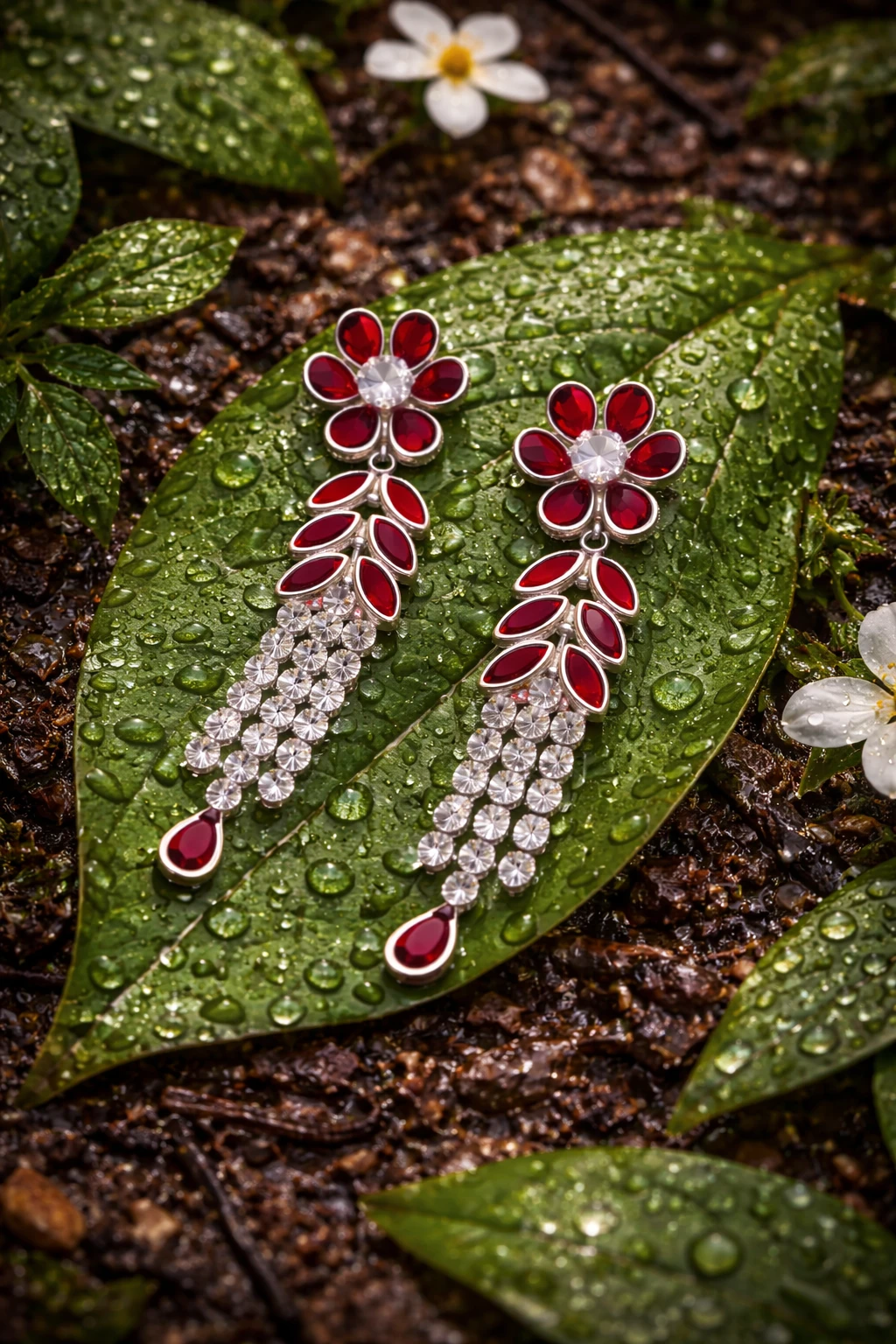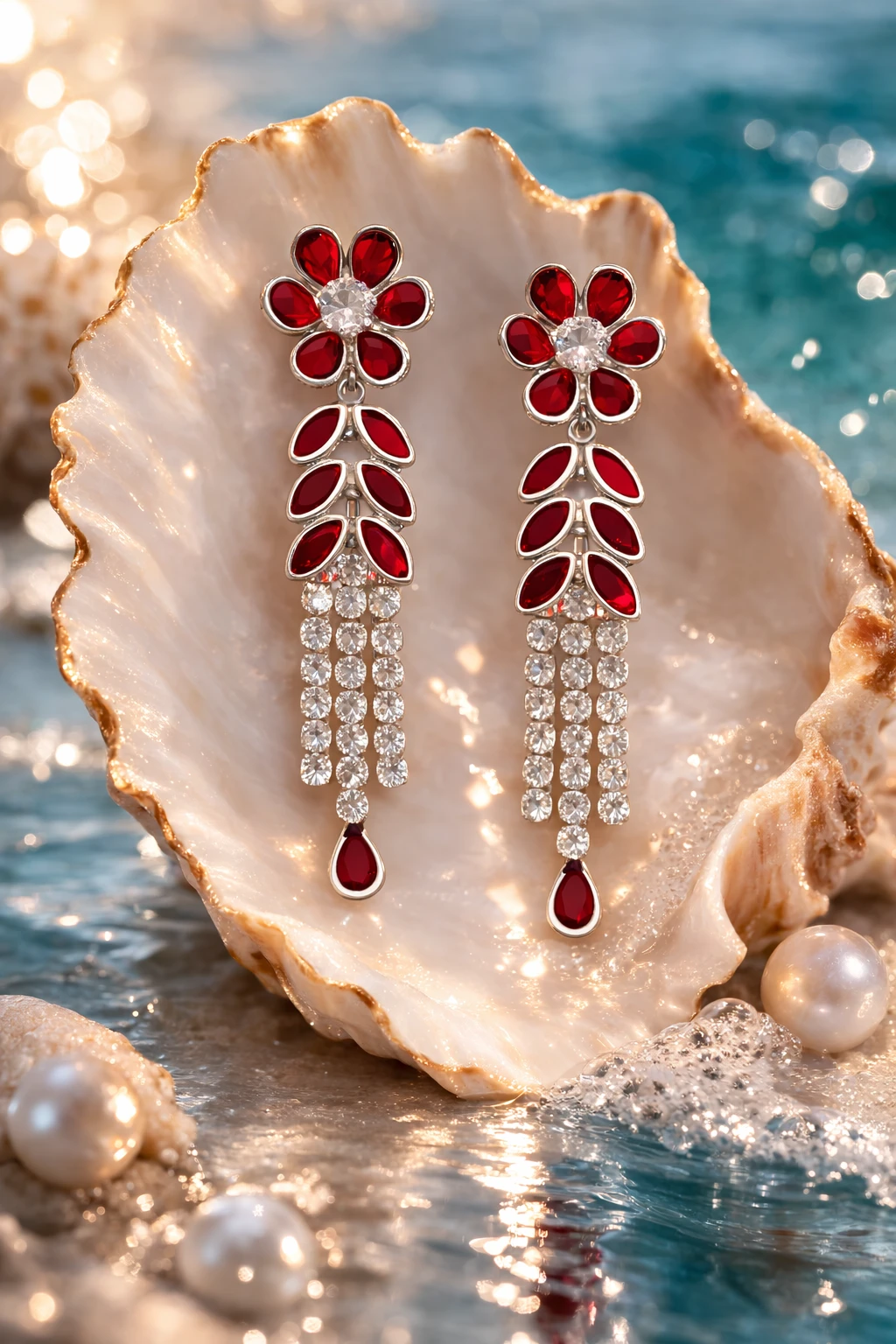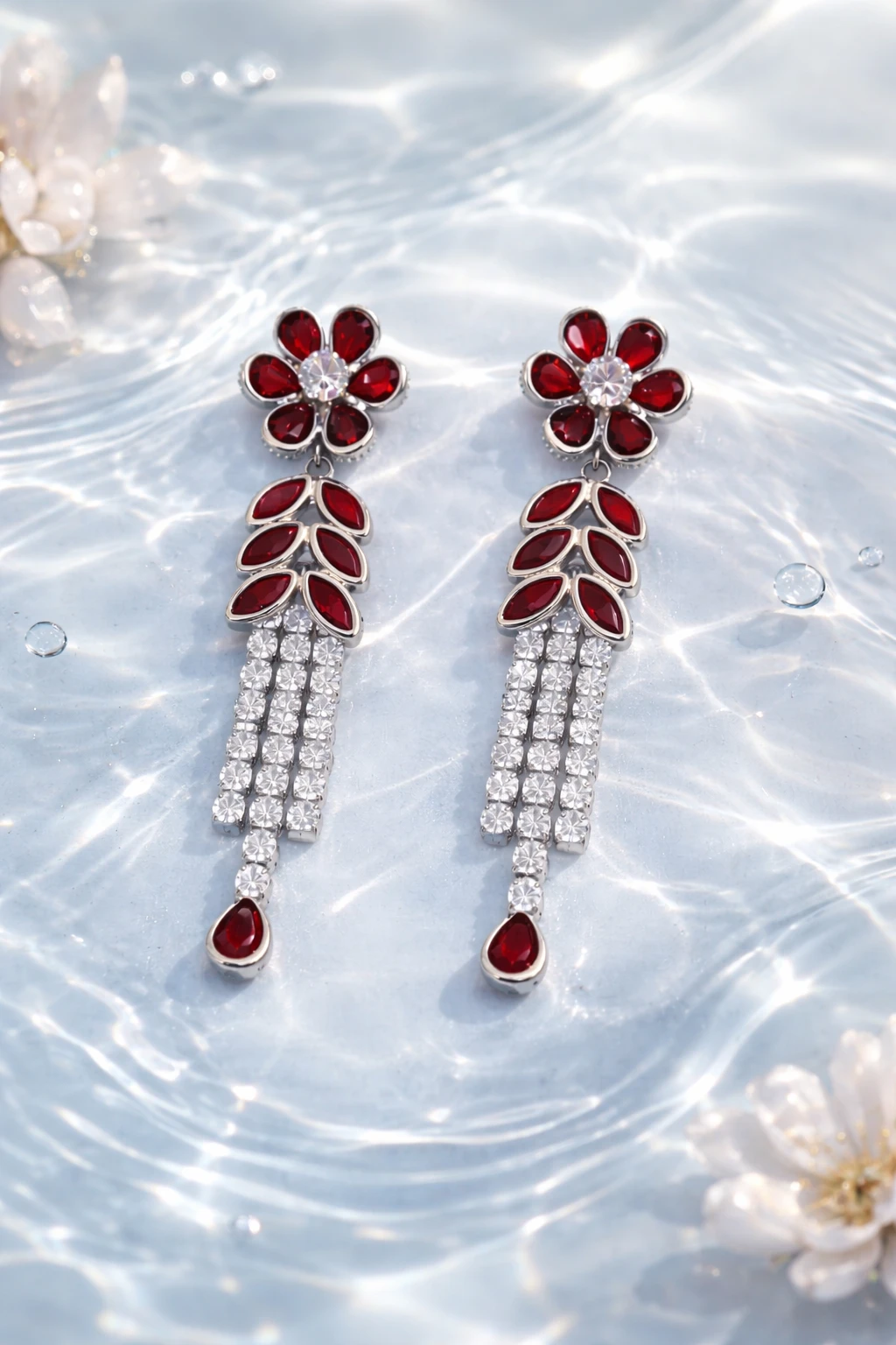 Ignite your evening look with our Ruby Bloom Chandeliers, a masterpiece of romantic design and fiery brilliance. These Red Crystal Chandelier Earrings are crafted for the woman who wants to command the room. Featuring a vibrant floral stud and cascading crystal tassels, they offer a perfect blend of botanical beauty and high-fashion glamour.