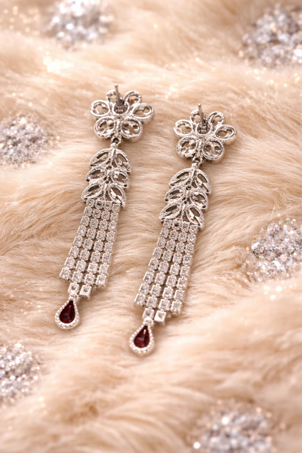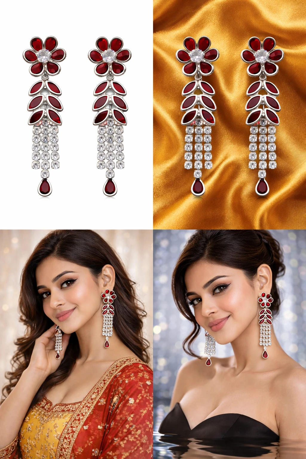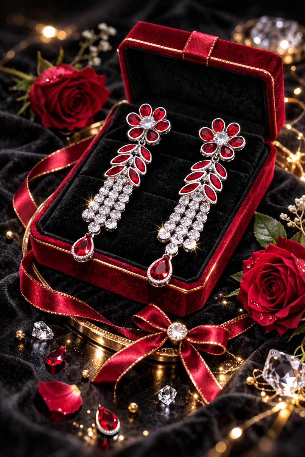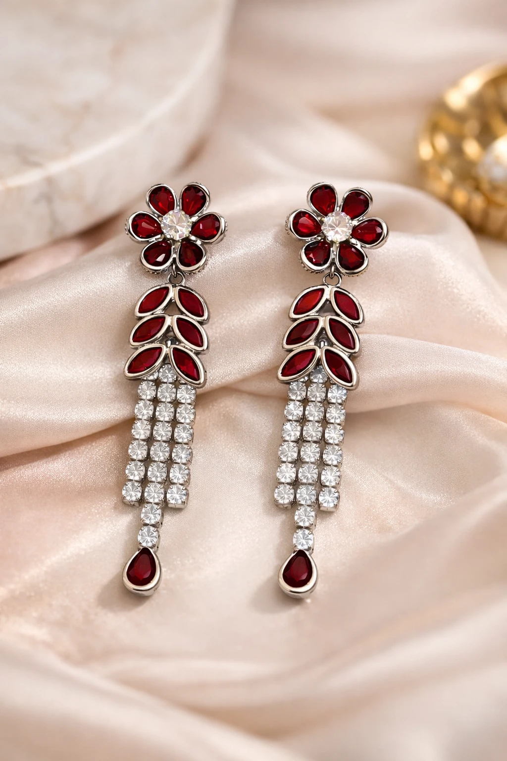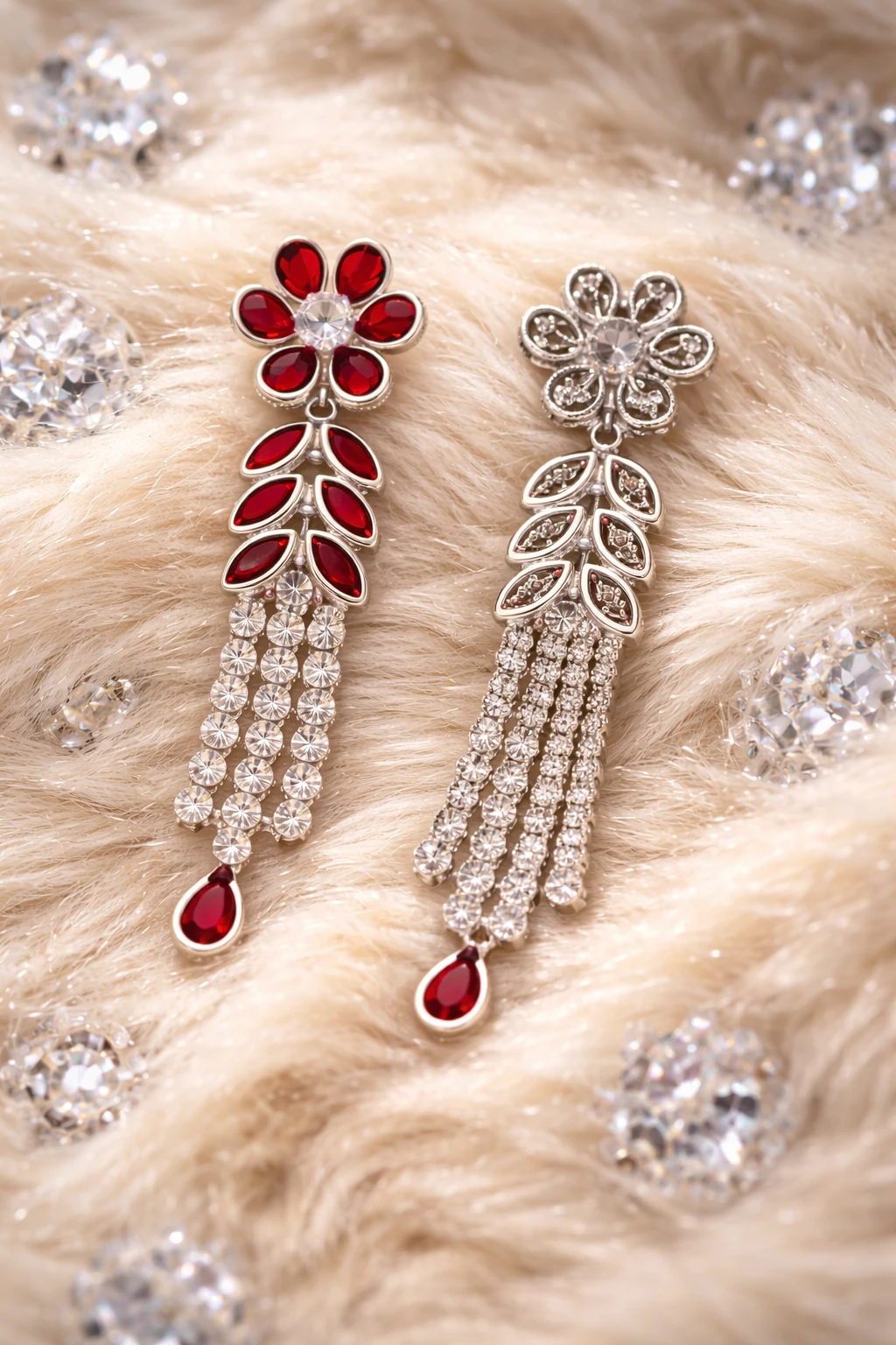 Ignite your evening look with our Ruby Bloom Chandeliers, a masterpiece of romantic design and fiery brilliance. These Red Crystal Chandelier Earrings are crafted for the woman who wants to command the room. Featuring a vibrant floral stud and cascading crystal tassels, they offer a perfect blend of botanical beauty and high-fashion glamour.